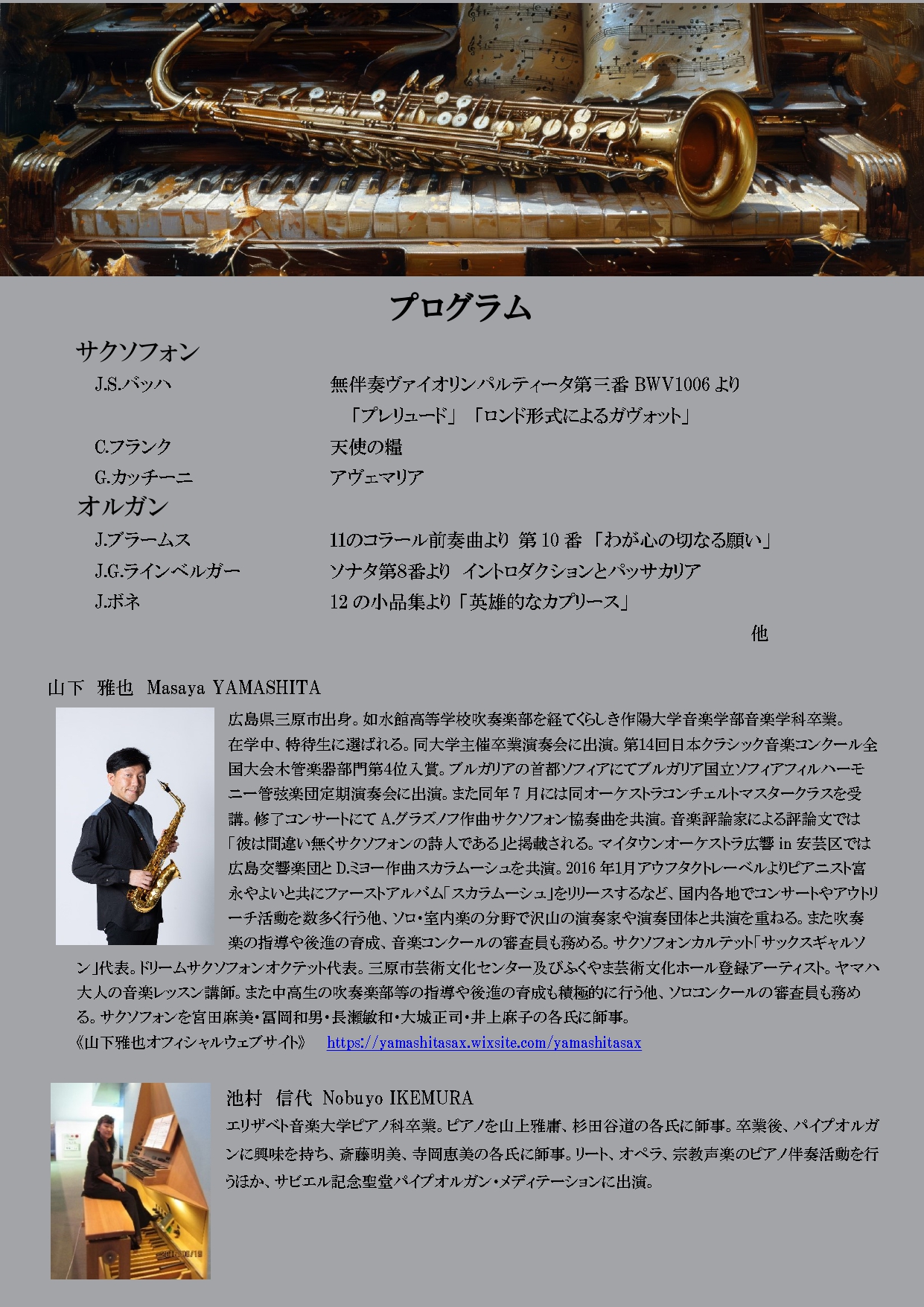 第358回オルガンメディテーションのご案内です。少し早いご案内ですが、10月のオルガンメディテーションのご案内をいたします。今年の9月は猛暑の日が続き、一体10月はどうなることでしょう。お彼岸には秋の気配を感じる季節となると良いのですが。今回は、秋に音色にぴったりのサクソフォンとパイプオルガンです。どうぞお誘い合わせてお越しください。