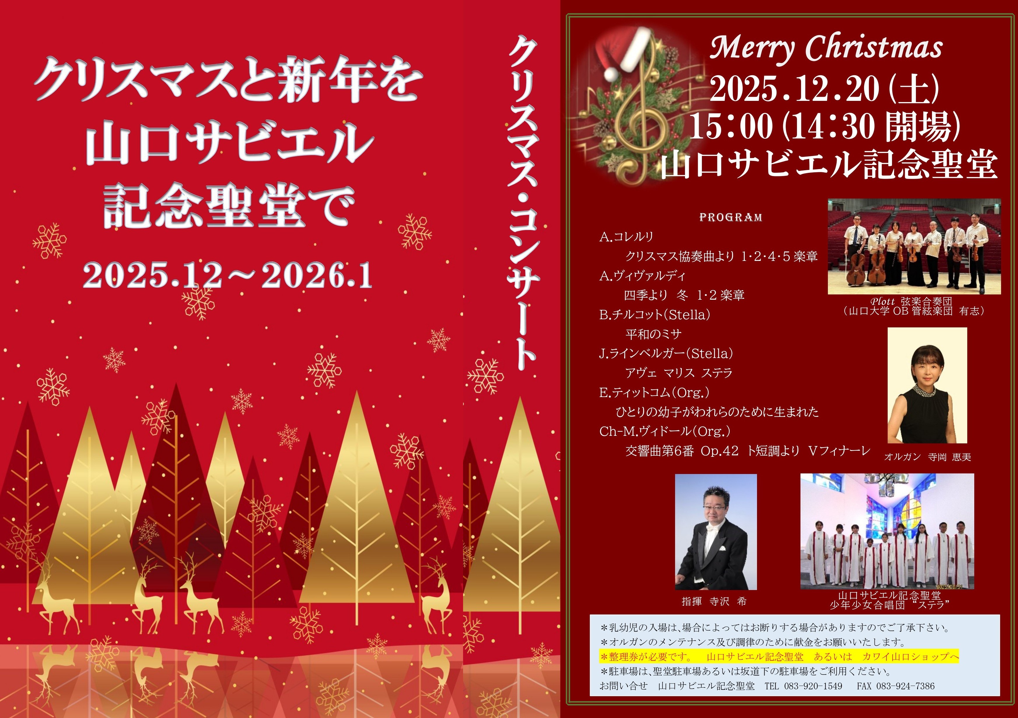クリスマスコンサートのご案内です。 今年もクリスマスシーズンがやってきました。サビエル記念聖堂は恒例のクリスマスコンサートを行います。今年もクリスマスはサビエル記念聖堂で素晴らしい音楽を聴きながらお過ごしください。詳細は下記よります。入場に関しては整理券が必要となりますので、お早めにお申込みください。